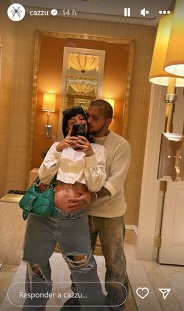 A través de sus historias de Instagram, la cantante compartió un par de fotografías, desde el hotel en el que se hospedan, donde aparece al lado de su novio y presumiendo su pancita. En la imagen, se puede ver a Julieta, nombre real de la trapera, posando frente al espejo de un elevador, mientras que el cantautor se encuentra atrás de ella, besando su mejilla y acariciando su vientre.